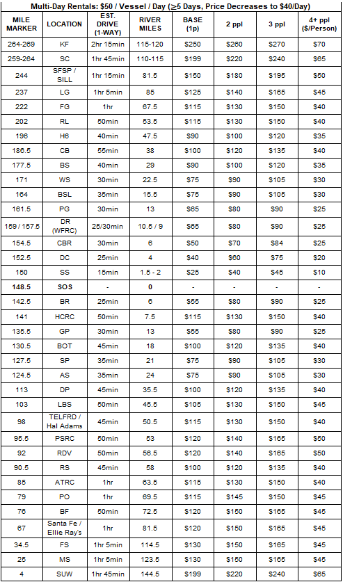 you up. Canoe rental per day is $50 for trips from 2 to 5 days and $40 for trips more than 5 days. River miles listed on the price table is the distance